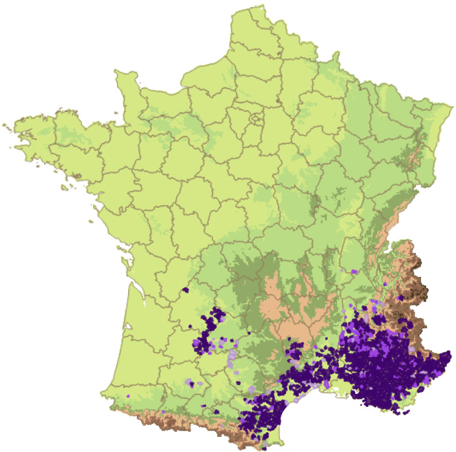 | Écologie : Côteaux pierreux, garrigues depuis le Lot, l'Aveyron, le Cantal, le Lyonnais et la Savoie jusqu'à la Méditerranée ; Corse. |